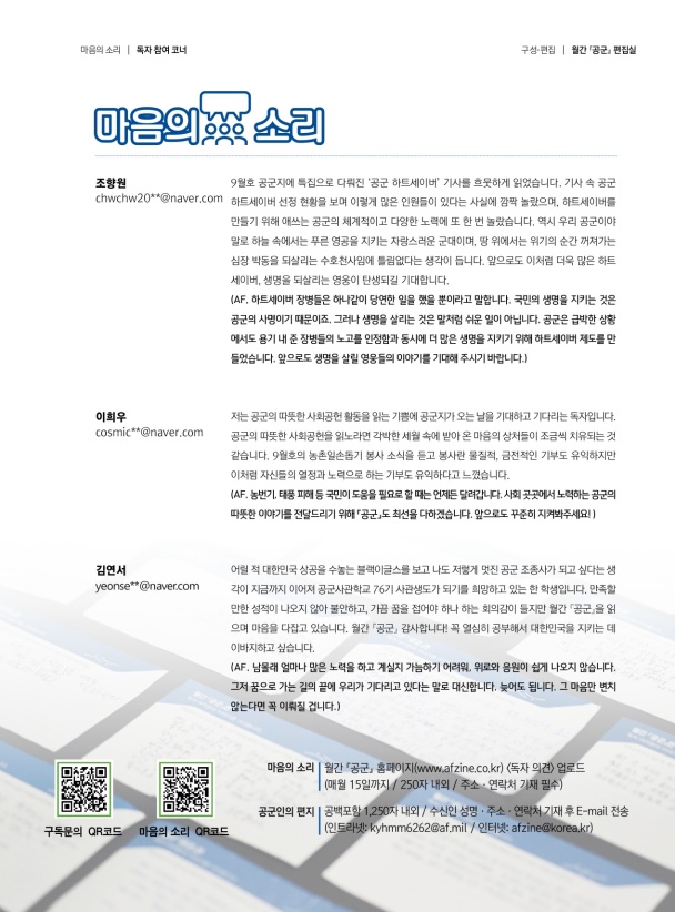 (인트라넷:kyhmm6262@af.mil/인터넷:afzine@korea.kr)